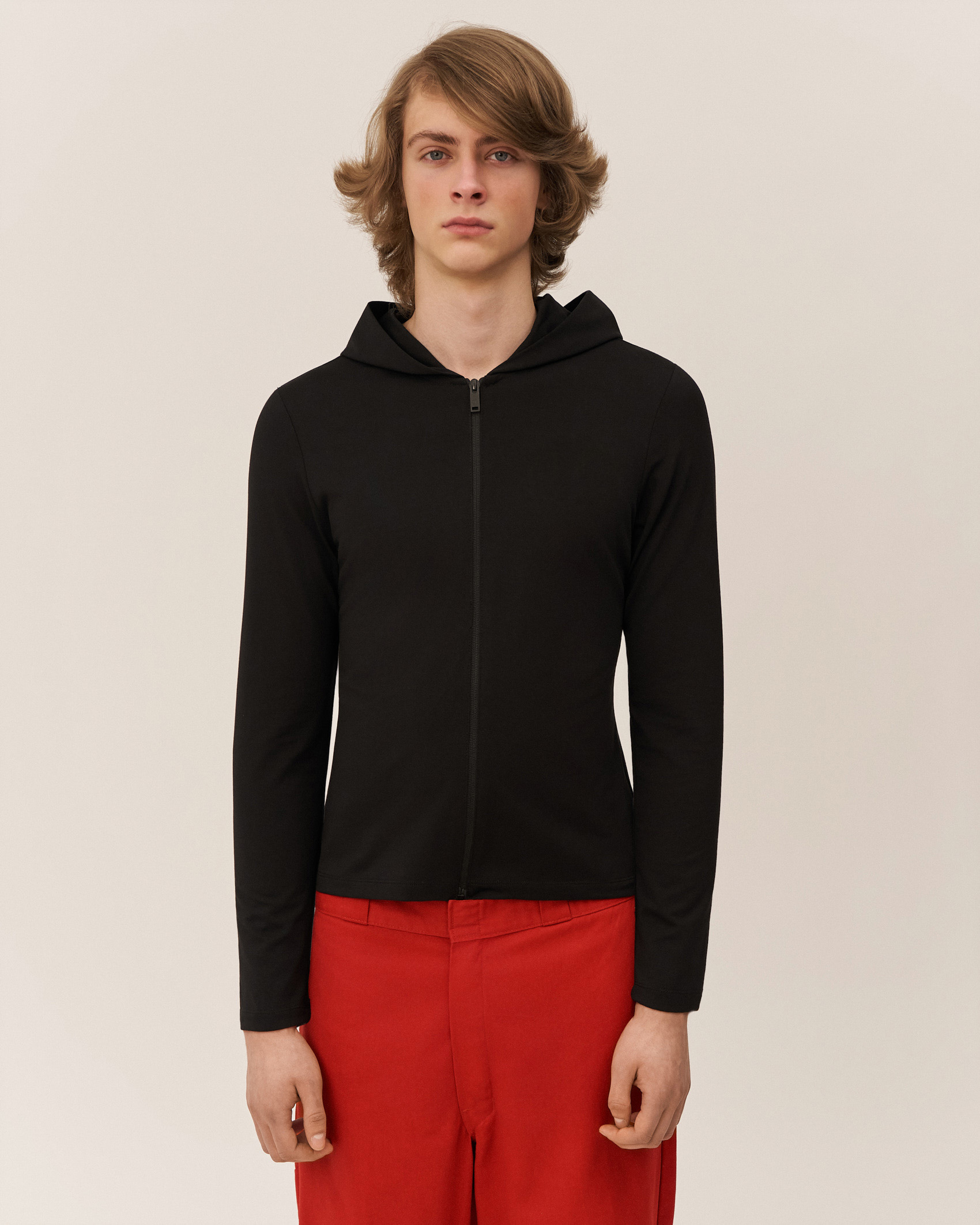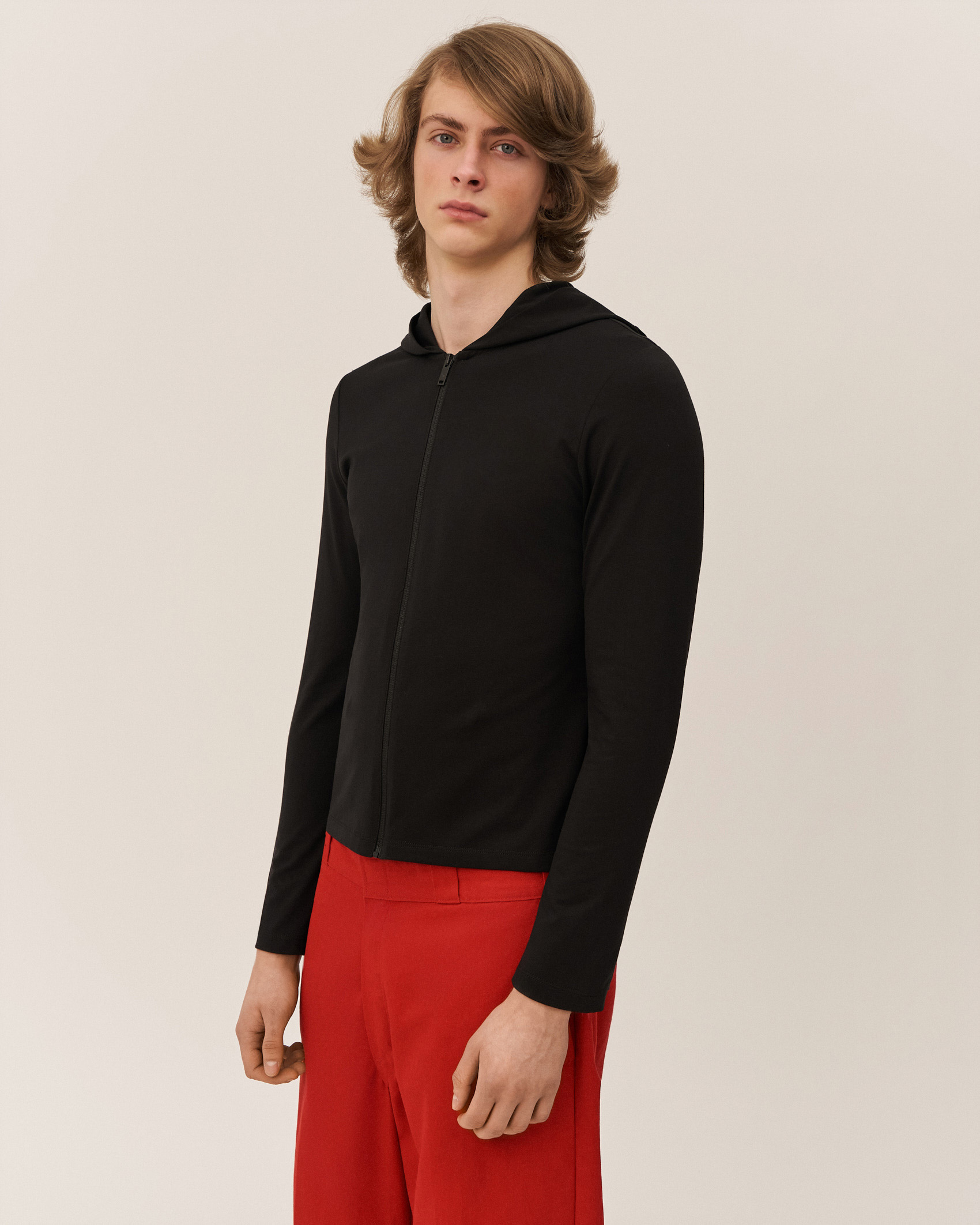 Худи на молнии из облегченного хлопка. Приталенный силуэт, спущенная линия плеч, мягкий эластичный материал.