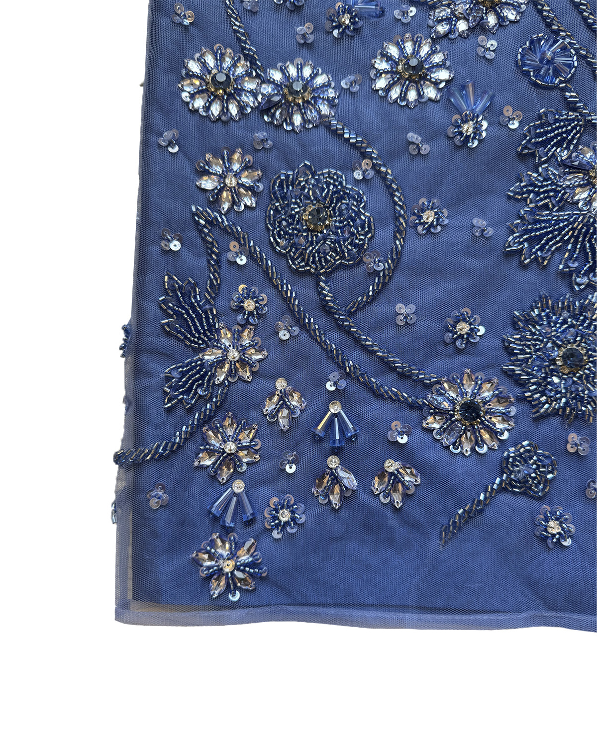 4. При необходимости возможно аккуратное отпаривание с изнаночной стороны на минимальном температурном режиме, избегая контакта с вышивкой, стразами и декоративными деталями.